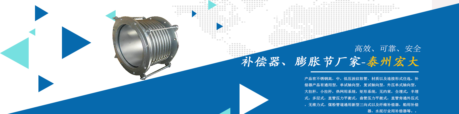 泰州市宏大機械設備有限公司是一個企業內部管理嚴謹,工作作風穩(wěn)健,職工素質水平較高,經濟實力雄厚,產品質量放心,外部形象良好的企業。本公司專業從事補償器廠家,膨脹節(jié)廠家,膨脹節(jié)補償器,其中有不銹鋼高,中,低壓波紋軟管,材質以及連接形式任選。補償器產品有通用型,單試軸向型,復試軸向型,外壓單式軸向型,大拉桿,小拉桿,熱網用系統,矩形系統,無約束,全埋式,半埋式,多層式,直管壓力平衡式,曲管壓力平衡…...